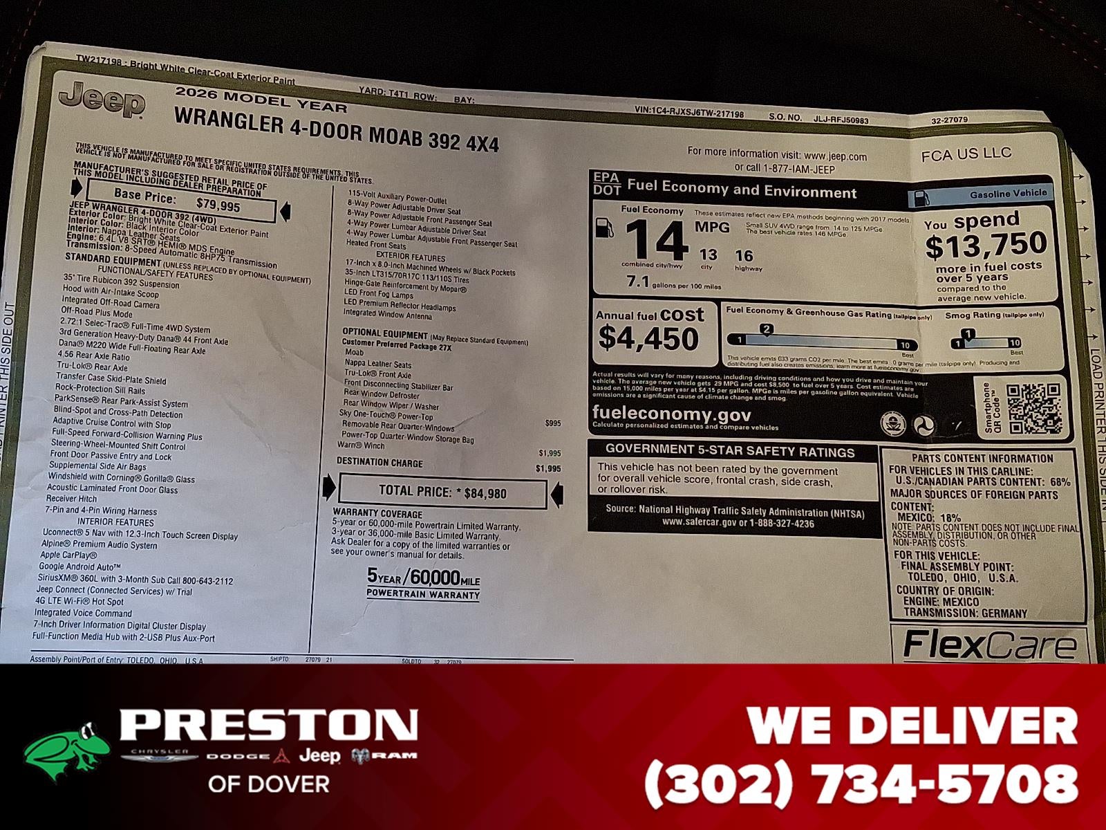 6.4L V8 SRT HEMI MDS ENGINE, 8-SPEED AUTOMATIC 8HP75 TRANSMISSION, QUICK ORDER PACKAGE 27X MOAB, BRIGHT WHITE CLEARCOAT, BLACK, NAPPA LEATHER SEATS, SKY ONE-TOUCH POWER TOP, WARN WINCH, FRONT LICENSE PLATE BRACKET