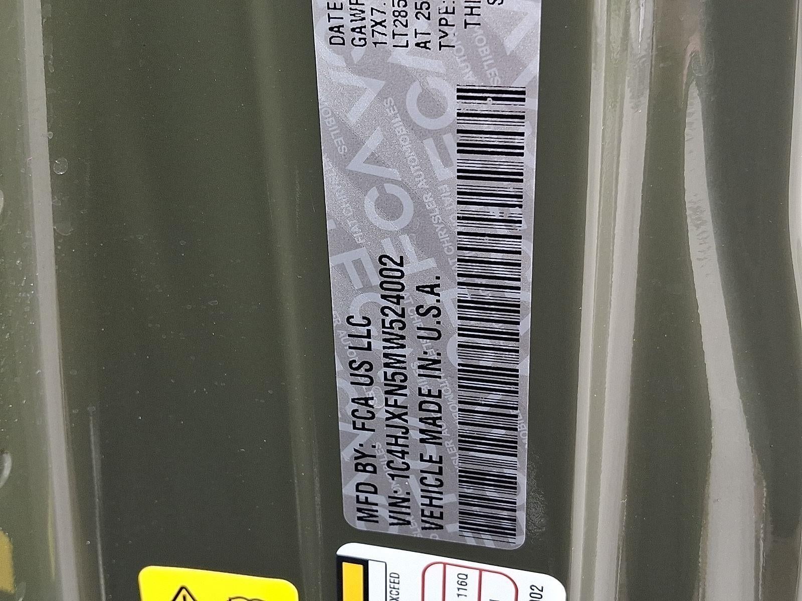PERFORMANCE SUSPENSION, ENGINE: 2.0L I4 DOHC DI TURBO W/ESS, TRANSMISSION: 8-SPEED AUTOMATIC (850RE), QUICK ORDER PACKAGE 22R, 4.10 REAR AXLE RATIO, WHEELS: 17"" X 7.5"" MACHINED W/BLACK POCKETS, TIRES: LT285/70R17C BSW OFF-ROAD, SARGE GREEN CLEARCOAT, BLACK, LEATHER TRIMMED BUCKET SEATS, GVWR: 5,800 LBS, LED LIGHTING GROUP, COLD WEATHER GROUP, PREMIUM BLACK SUNRIDER SOFT TOP, BODY COLOR FENDER FLARES, FRONT LICENSE PLATE BRACKET, REMOTE START SYSTEM